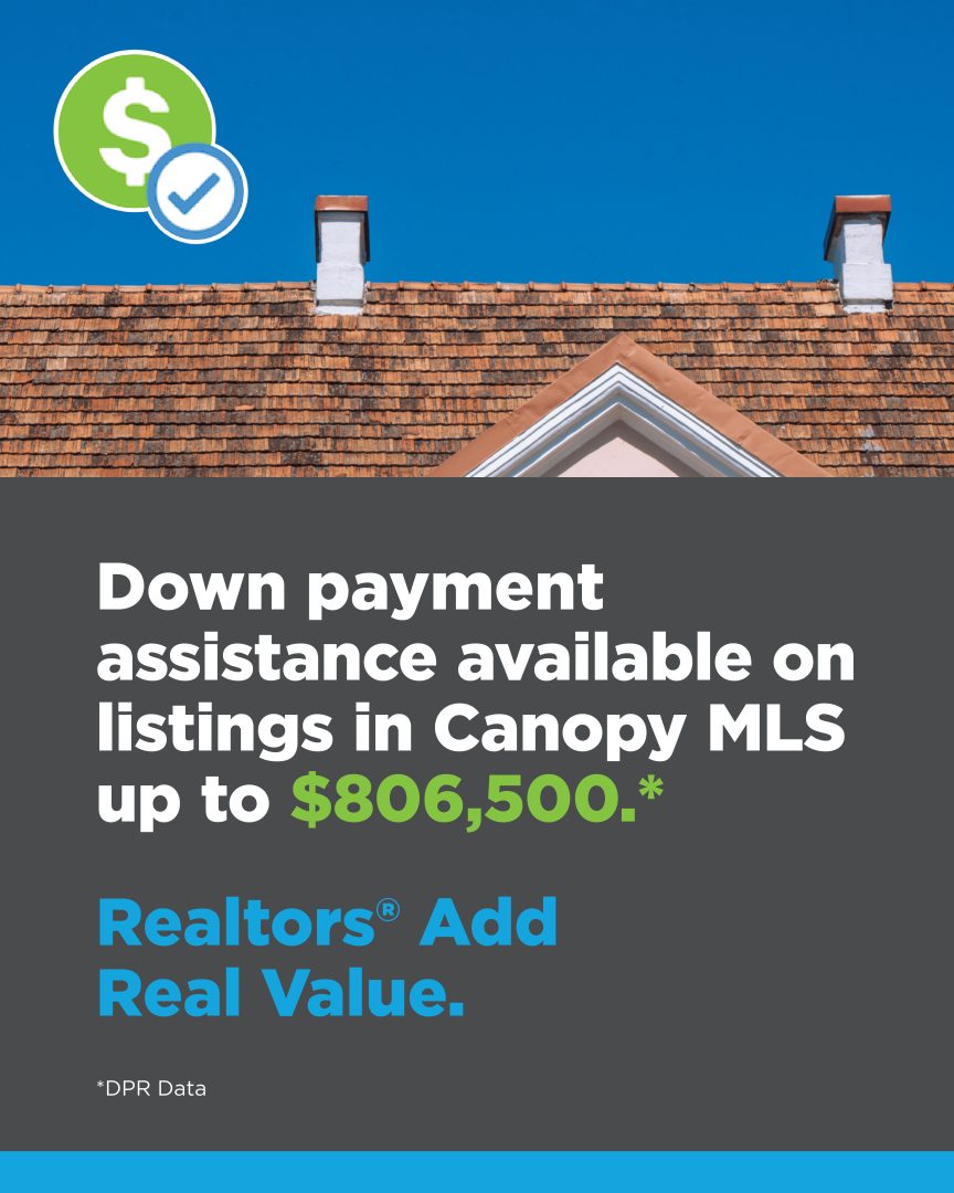 Down payment assistance available on listings in Canopy MLS up to $806,500.* Realtors® Add Real Value. *DPR data Square version (1080 x 1080, Facebook preferred size) DOWNLOAD Down payment assistance available on listings in Canopy MLS up to $806,500. * Realtors® Add Real Value. *DPR data Longer vertical version (1080 x 1350, Instagram preferred size) DOWNLOAD