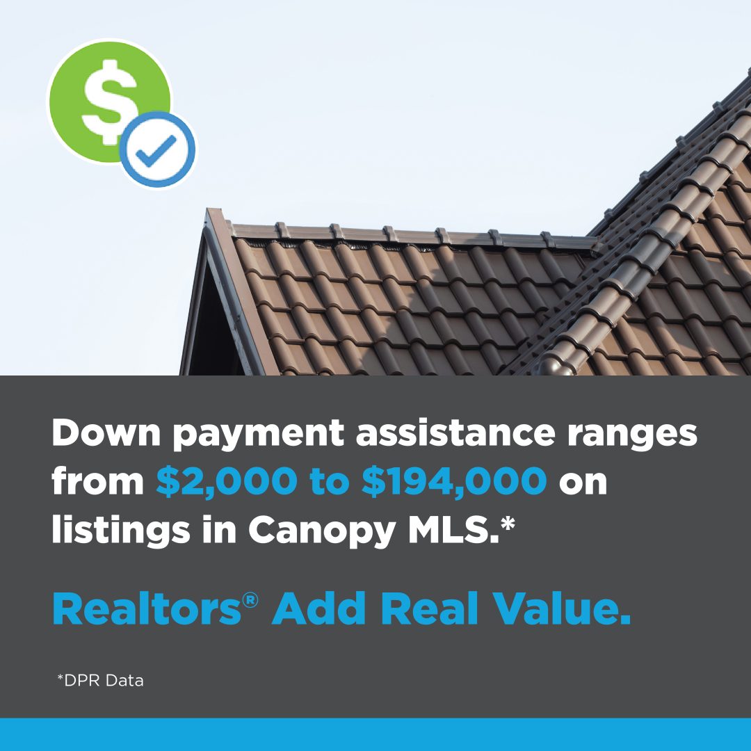 Down payment assistance ranges from $2,000 to $194,000 on listings in Canopy MLS. * Realtors® Add Real Value. *DPR data Square version (1080 x 1080, Facebook preferred size) DOWNLOAD Down payment assistance ranges from $2,000 to $194,000 on listings in Canopy MLS. * Realtors® Add Real Value. *DPR data Longer vertical version (1080 x 1350, Instagram preferred size) DOWNLOAD